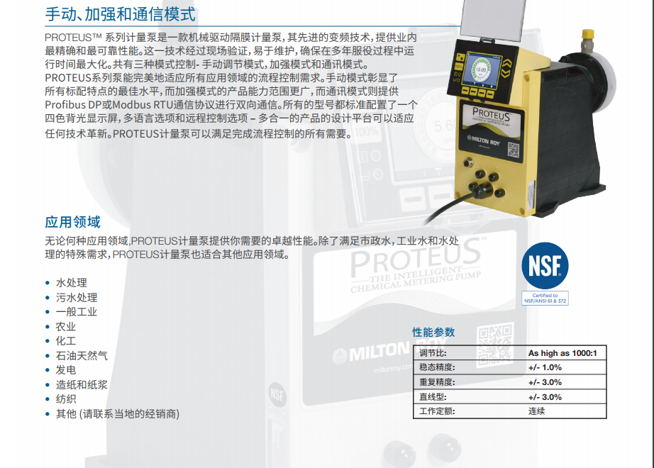 汉胜工业-米顿罗公司提供的PROTEUS™ 系列计量泵是一款机械驱动隔膜计量泵,其先进的变频技术,提供业内